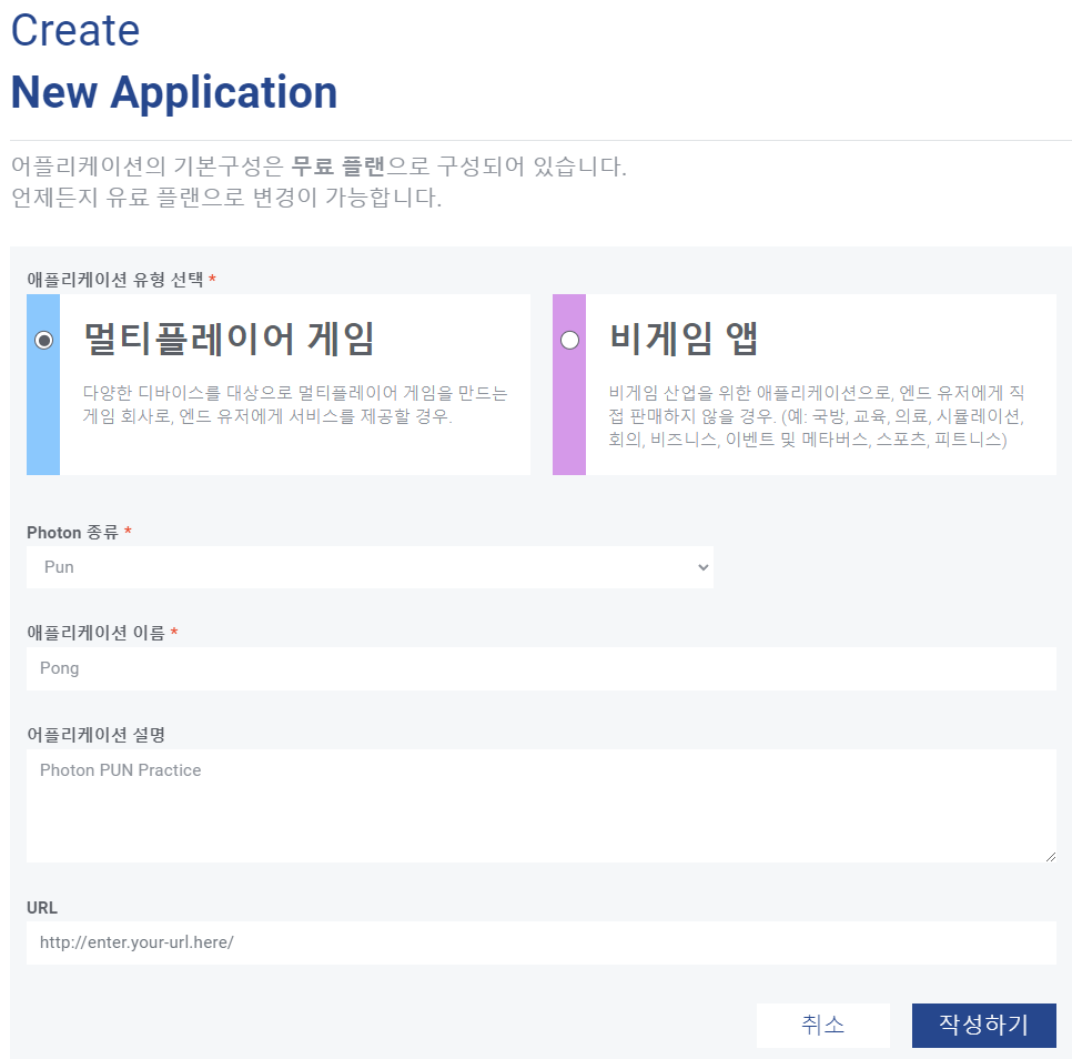 위와 같이 작성해주고 작성하기를 누르면, 어플리케이션이 생성되는데, 이 때 어플리케이션 ID를 복사하여 아까 유니티에서 봤던 Photon PUN Setup 창에 붙여넣어주자.